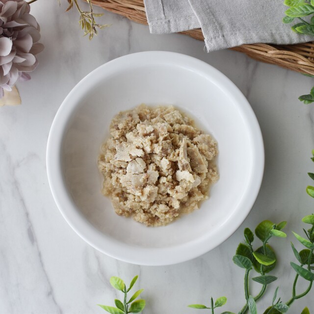 | 成分表 | エネルギー:113kcal/100g 粗たんぱく質15.1%以上/粗脂肪4.2%以上/粗灰分2.1%以下/炭水化物7.0%以下/粗繊維0.4%以下/水分72.6%以下 |