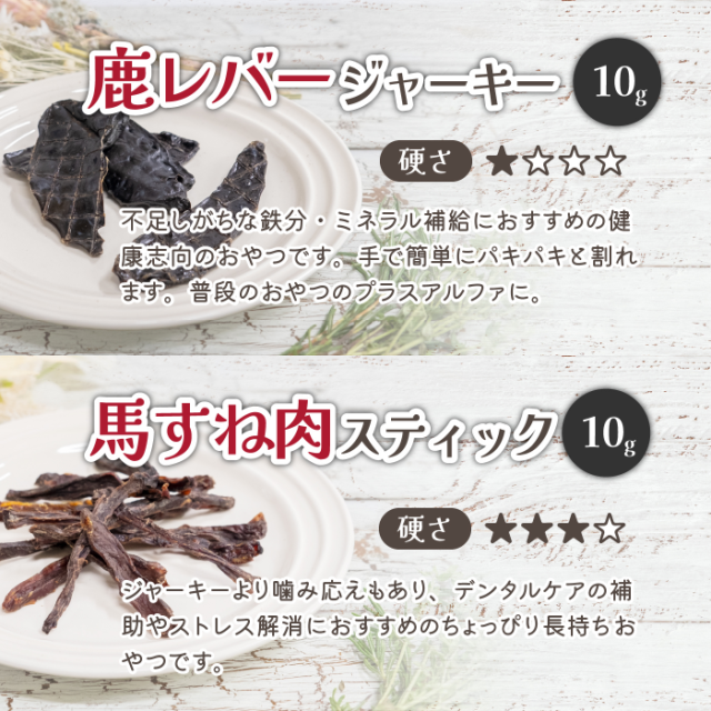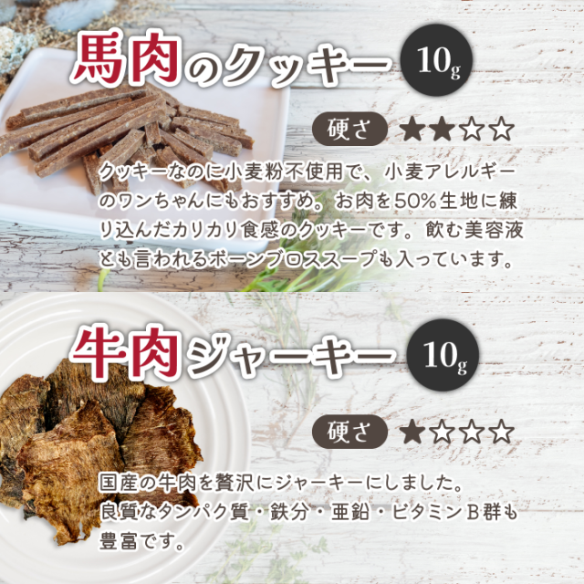 | 原材料 | ■馬肉チップ・馬すね肉スティック / 馬肉(九州産またはカナダ・アルゼンチン産) ■鹿肉ジャーキー・鹿レバージャーキー / 鹿肉(岡山県・鳥取県・九州産) ■猪肉のクッキー / 猪肉(岡山県・鳥取県・九州産)・猪骨スープ・米粉・大麦粉 ・ビール酵母 ■鶏ささみ細切 / 鶏ささみ(国産) ■馬肉のクッキー / 馬肉(九州産またはカナダ・アルゼンチン産)・馬骨スープ(馬骨 九州産) ・米粉(国産)・大麦粉(国産) ・ビール酵母(国産) ■カンガルーチップ / カンガルー肉(オーストラリア産) ■まぐろキューブ / キハダマグロ(静岡県焼津港水揚げ) ■牛肉ジャーキー / 牛肉(北海道産) |